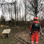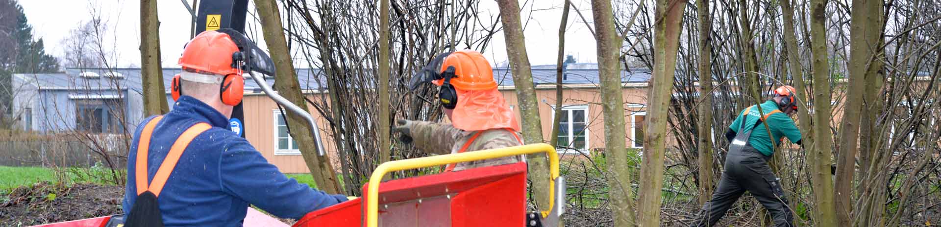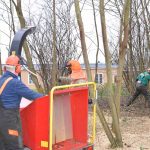 Til de 10 frivillige der lørdag morgen kl 9 samlede sig “På Banen” ved Borgerhuset i Dianalund. De var klar med motorsave, buskryddere og en stor flishugger, så der kunne blive tyndet grundigt ud i træbæltet mellem klatretårnet og legepladsen.
