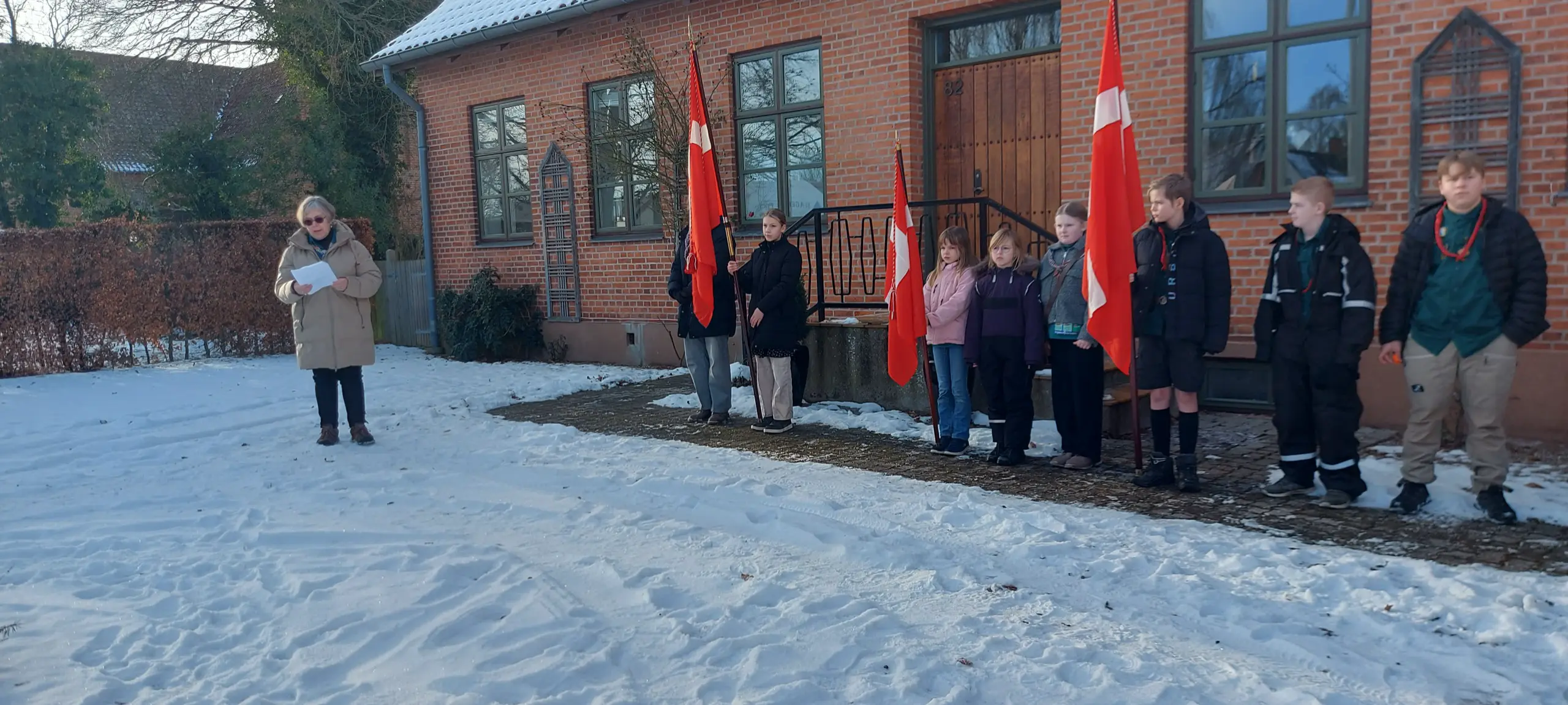 Herefter gik turen ud i vinterkulden, hvor flere spejdere – traditionen tro – stillede op i bare knæ. Årets nytårsappel blev holdt af Kirsten Krag, som er formand for spejdernes fælles hytte og samtidig kan fejre 60-års jubilæum som grøn pigespejder i 2026.